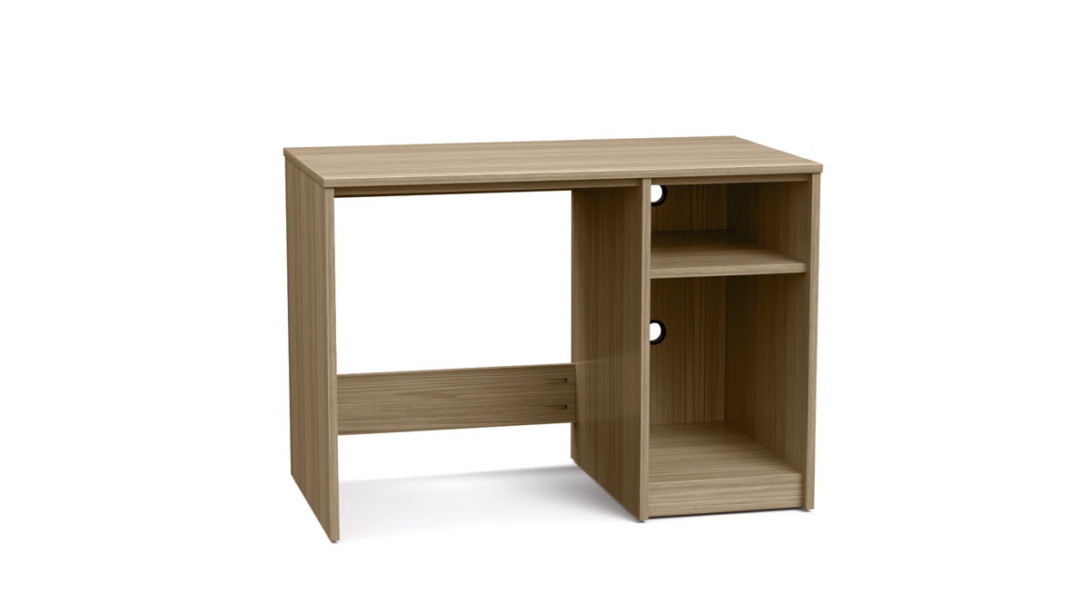 The Suite 42″ Desk without Drawers is constructed of dual-sided laminate with matching PVC edge band. It features two open storage compartments and adjustable floor glides.