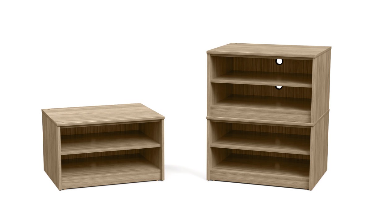 The Suite Chest Stacker without Drawers is constructed of dual-sided laminate with matching PVC edge band. It features two open storage compartments with wire access holes. Bring flexibility to your space by positioning Suite Chest Stackers side by side underneath an Adjustable Low Loft Bed or by stacking multiple units.