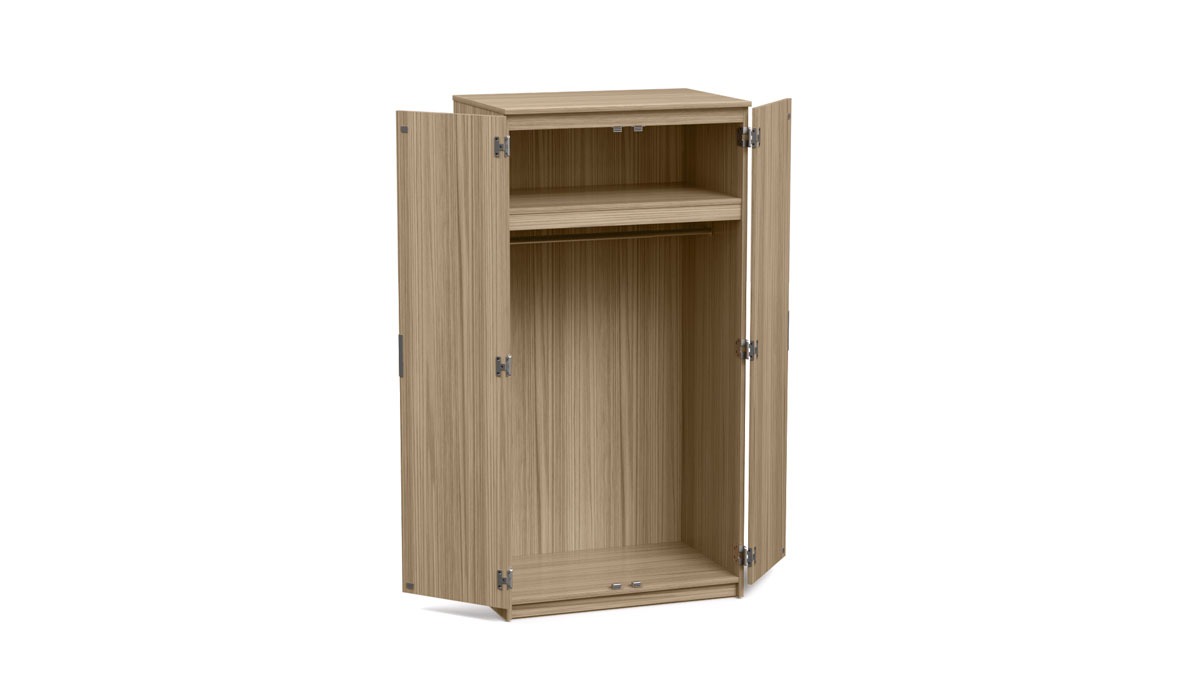 The Suite Double Wardrobe is constructed of dual-sided laminate and matching PVC edge band. A fixed top shelf, clothing rod, magnetic doors and adjustable floor glides provide function and convenience.